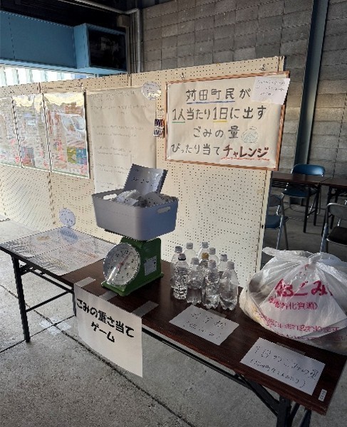 ふるさと苅田地産地消フェアに来場した県民に対し、食品ロスのパネル展示を見てもらい、苅田町民1人の1日当たりのゴミの量のうち厨芥類のグラム数を当ててもらう簡単なゲームを実施してもらった。