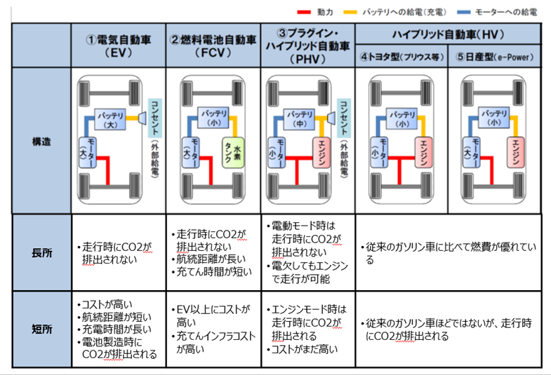 (PHV・PHEV)」、水素を使って電気をつくる「燃料電池自動車(FCV・FCEV)」があります。