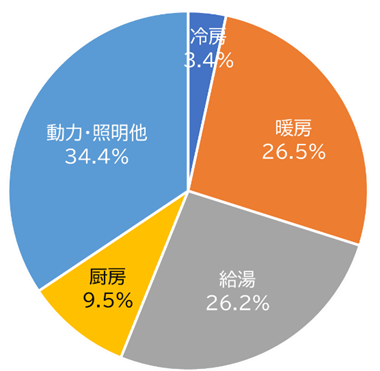 動力・照明他が最も大きく、給湯、暖房、厨房、冷房と続きます。