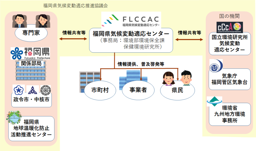 - 福岡県気候変動適応推進協議会を開催し、気候変動の影響や適応策について関係者間で情報共有し、県内における効果的な適応策の推進を図ります。